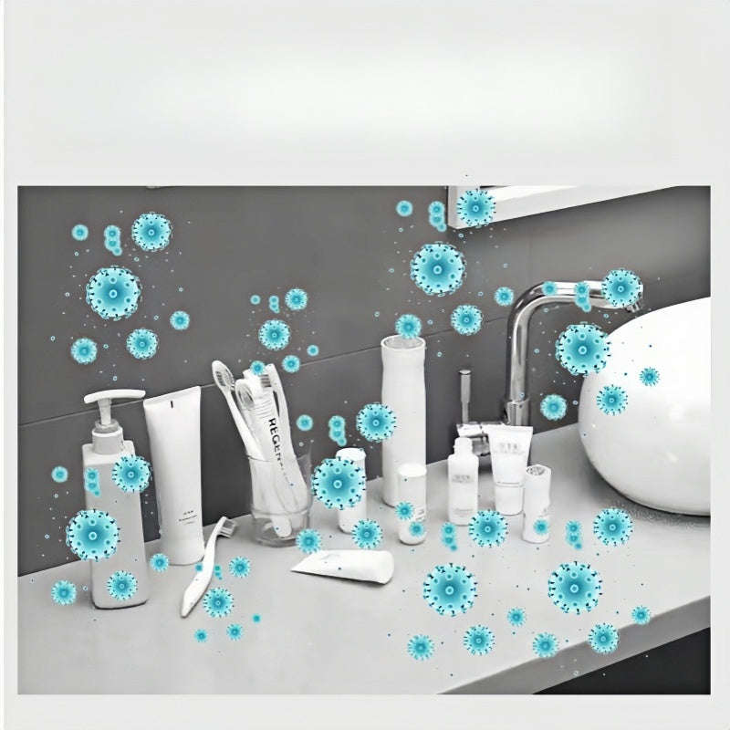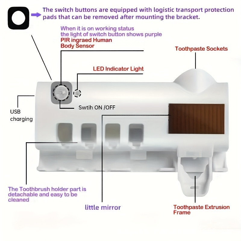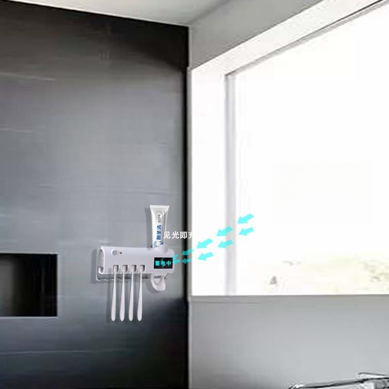 Suporte para escova de dentes elétrica com armazenamento integrado, sensor inteligente, esterilização, ventilação e drenagem eficiente.