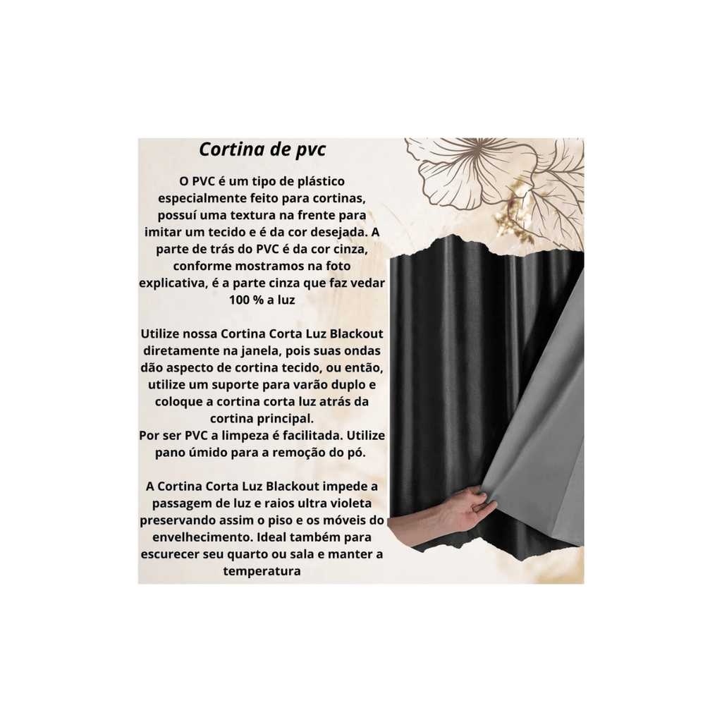 A Cortina Blackout 2,20 x 1,30m em PVC é a solução perfeita para quem busca privacidade, conforto térmico e proteção contra raios UV. Ideal para quartos, salas de estar e qualquer espaço que precise de escuridão total.