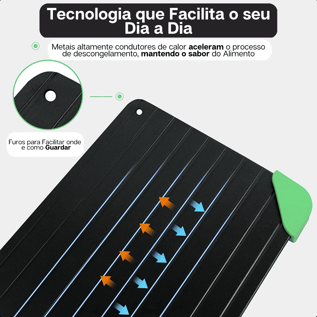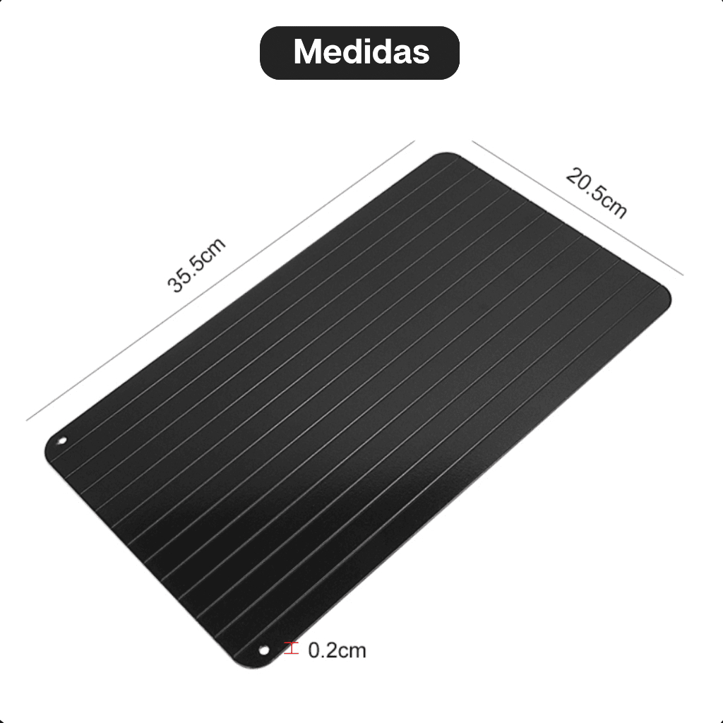 Feita em aço carbono de alta condutividade, a bandeja transfere o calor ambiente diretamente para o alimento, descongelando carnes, frangos, peixes e até refeições prontas muito mais rápido.
