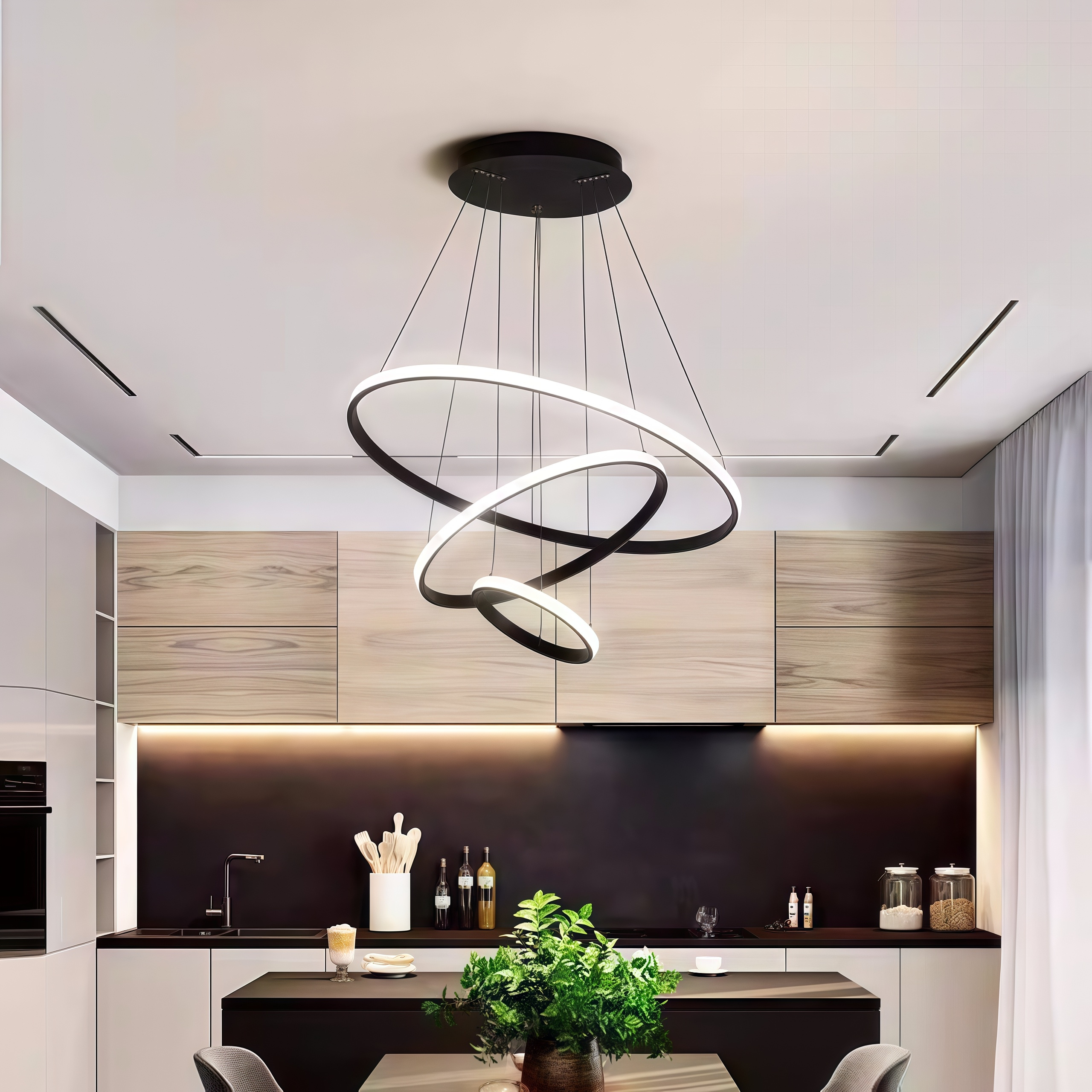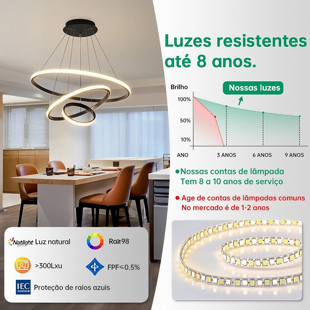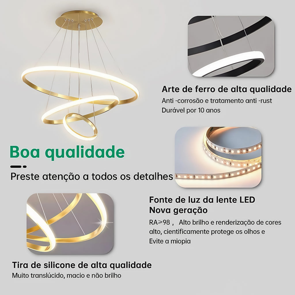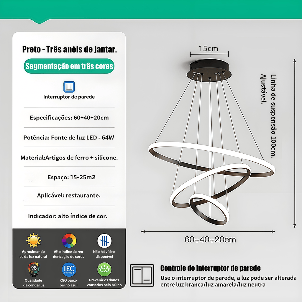 Três anéis de diferentes diâmetros (60-40-20 cm) suspensos por cabos de aço ajustáveis até 1 metro, permitindo personalizar a altura conforme o seu ambiente.