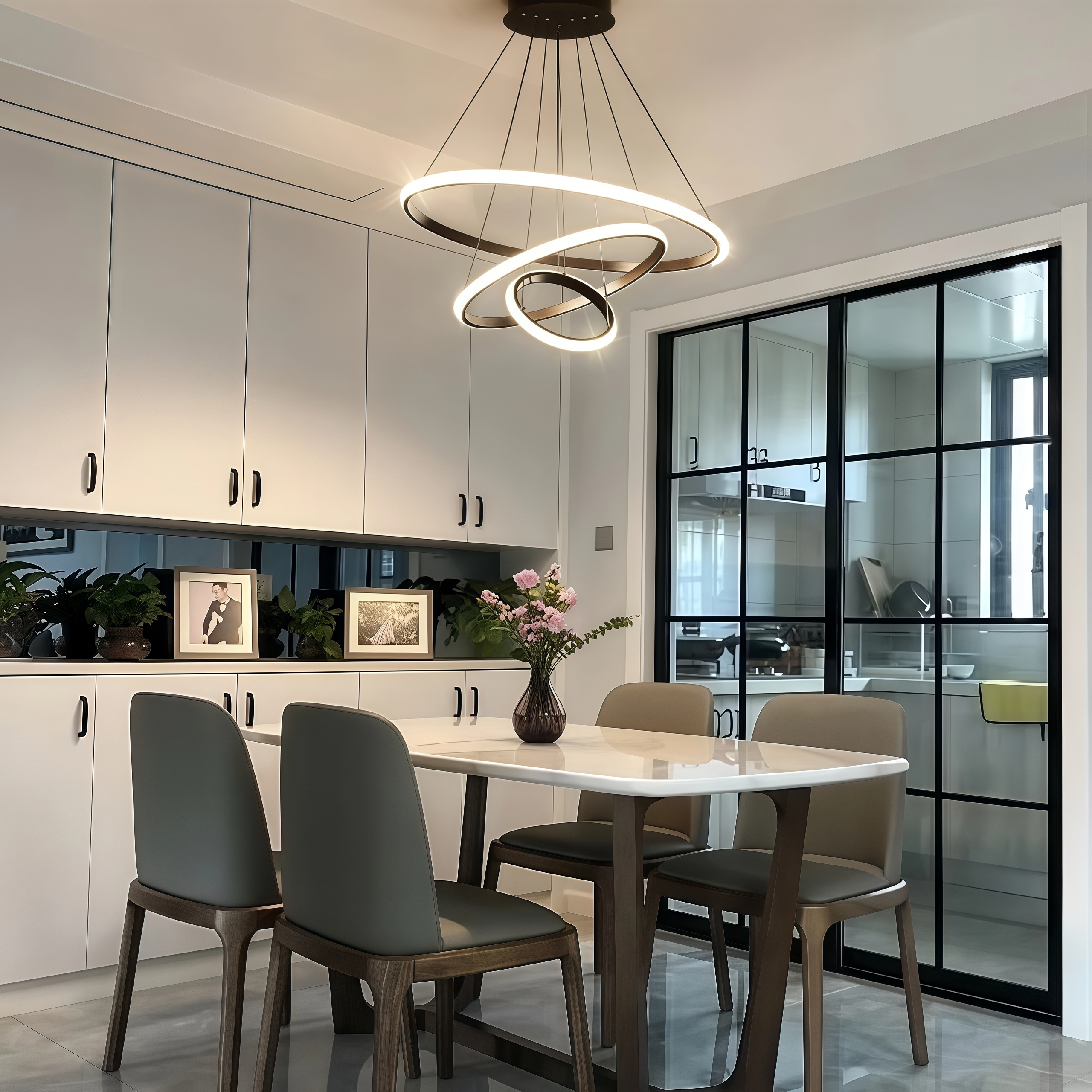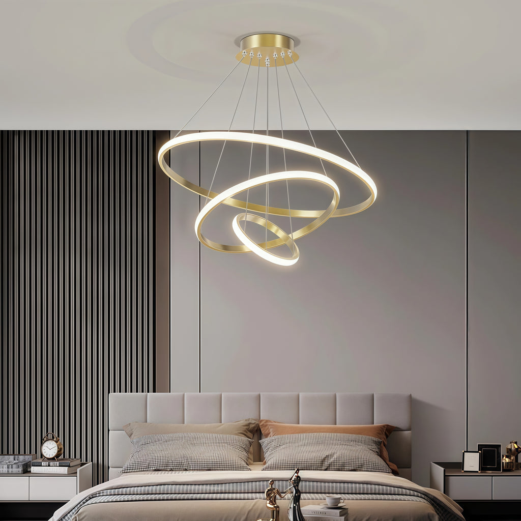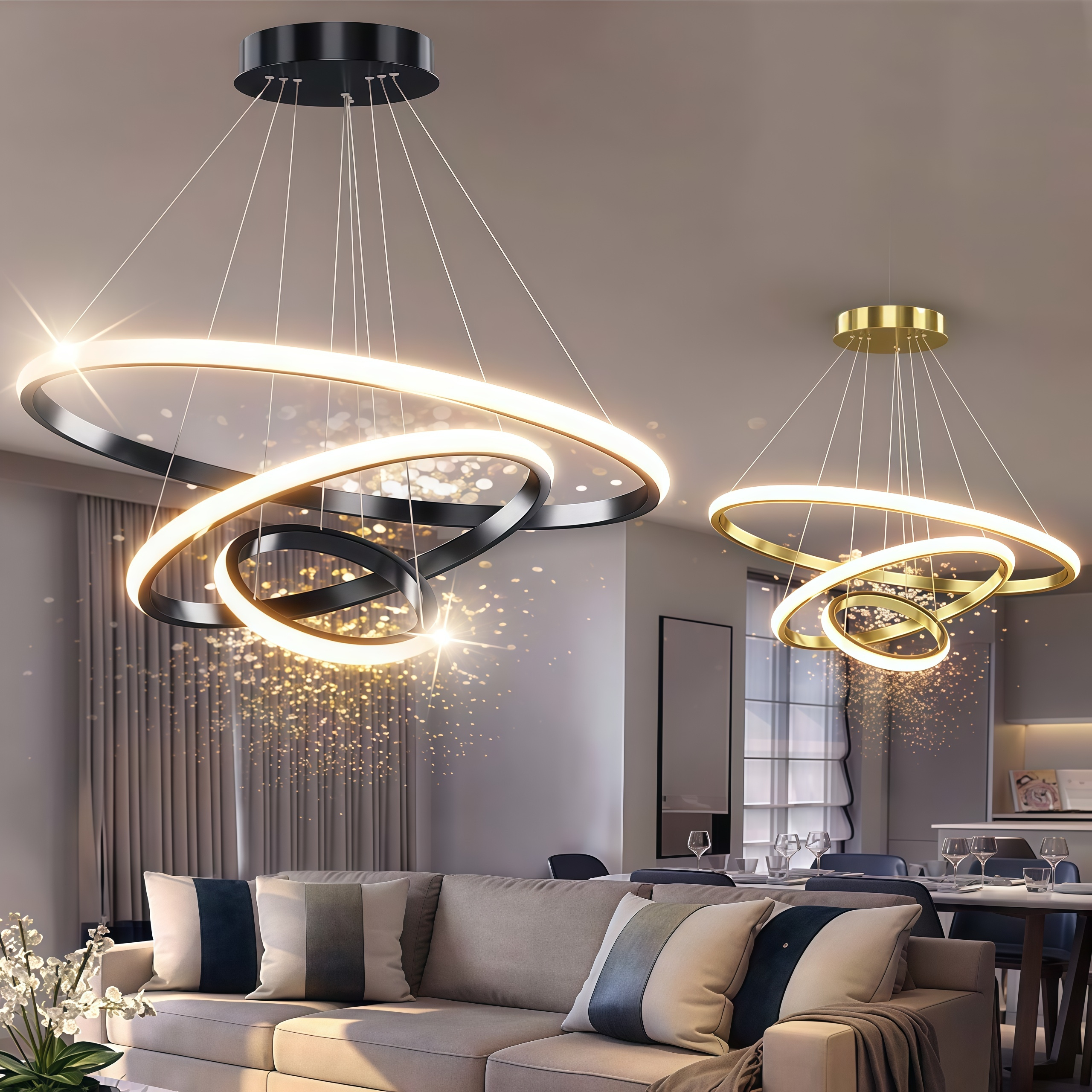 Três anéis de diferentes diâmetros (60-40-20 cm) suspensos por cabos de aço ajustáveis até 1 metro, permitindo personalizar a altura conforme o seu ambiente.