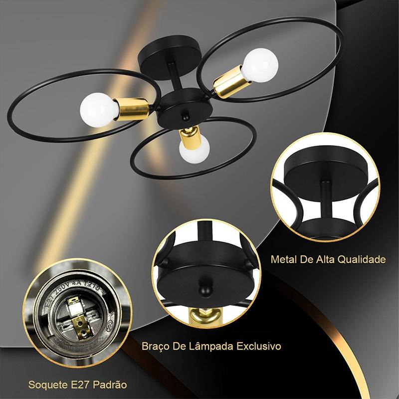 O contraste entre o preto fosco e o dourado brilhante cria um visual impressionante. Seus anéis flutuantes transformam a luminária em um verdadeiro objeto decorativo, ideal para ambientes modernos, minimalistas ou requintados.