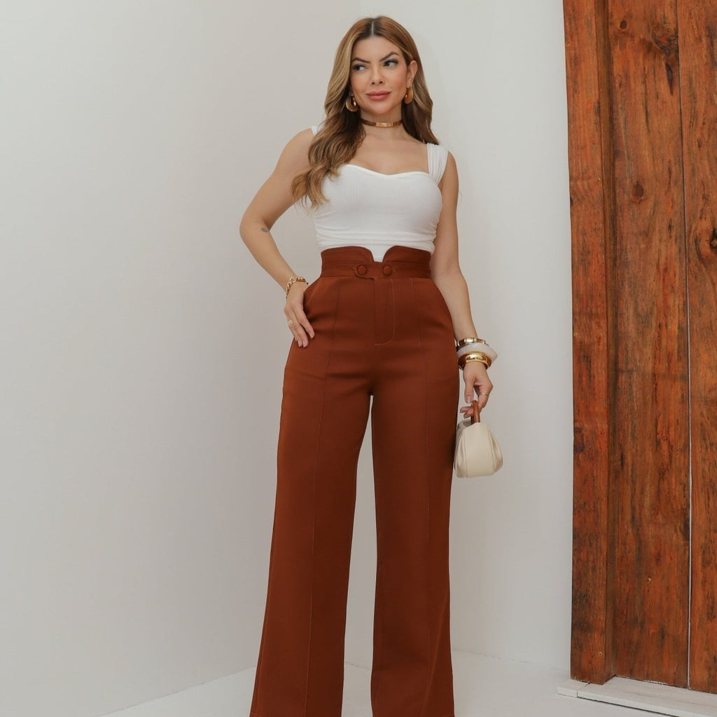 Com modelagem wide leg, caimento regular e tecido em 100% poliéster, esta calça une leveza, estilo e praticidade para qualquer ocasião.