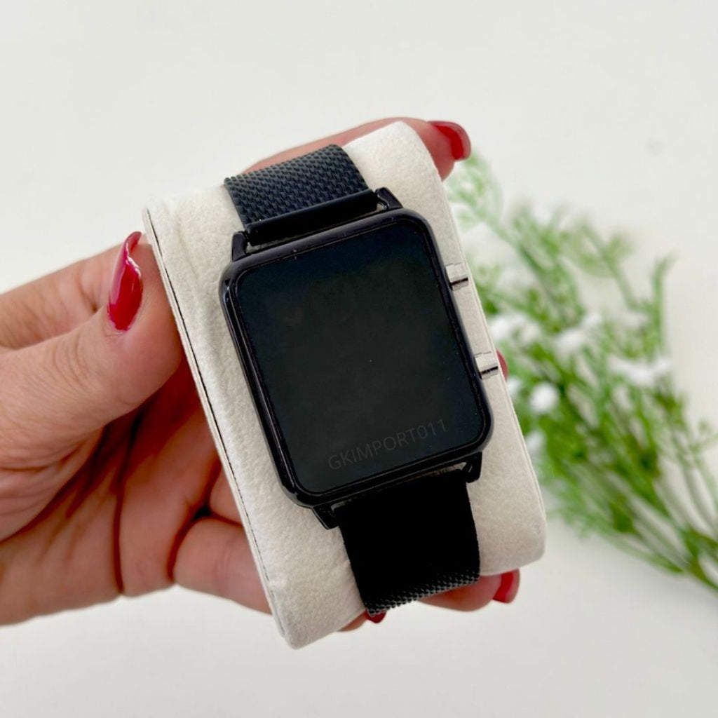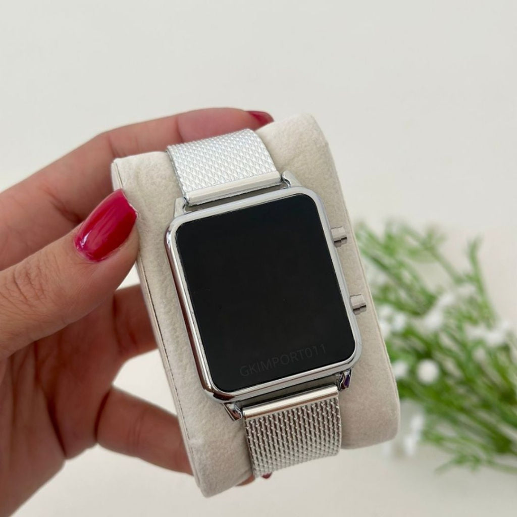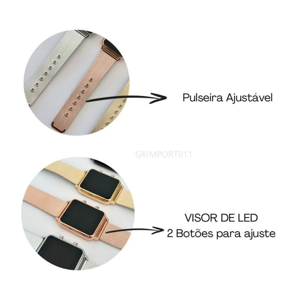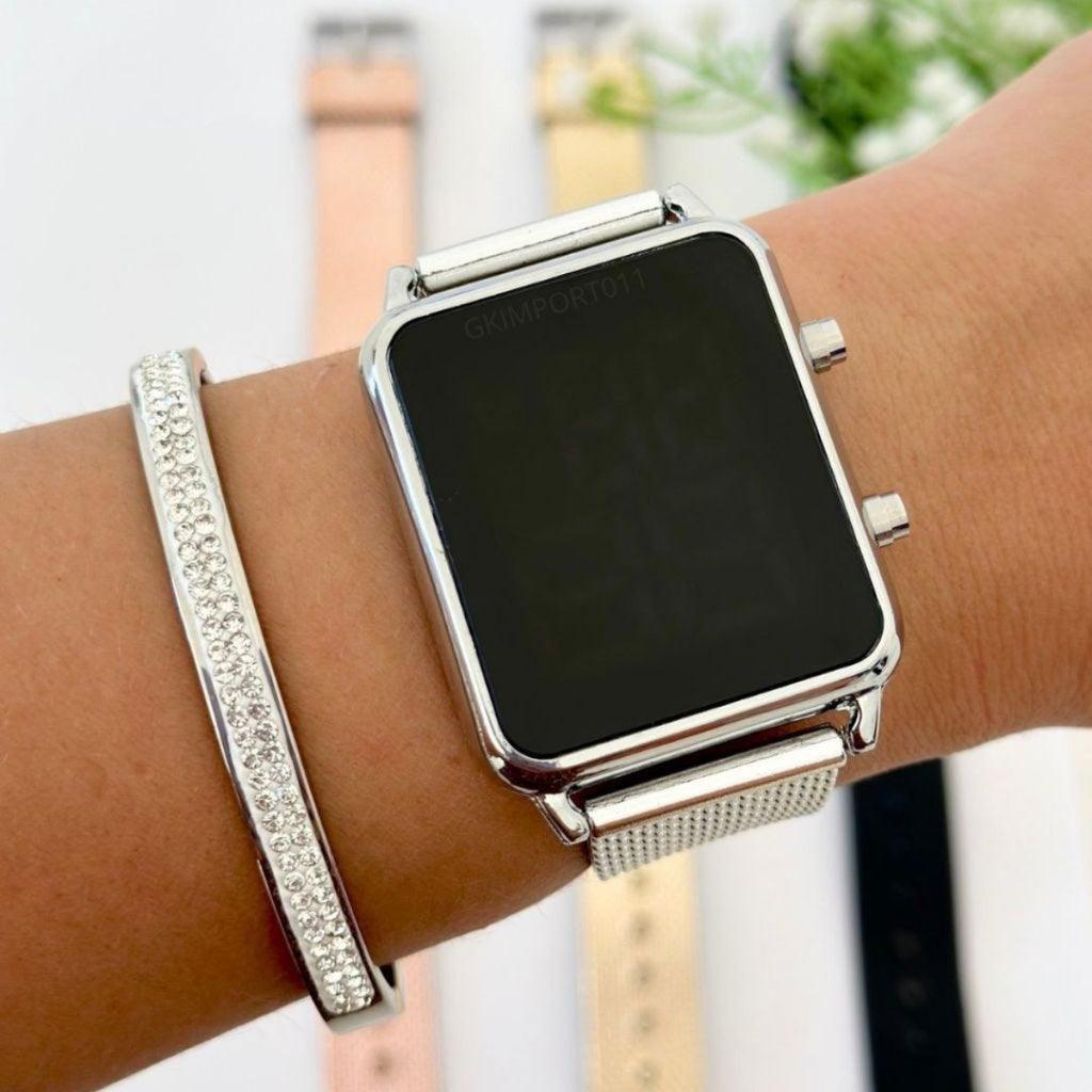 O Relógio Digital Quadrado com design moderno e funcionalidade para acompanhar seu dia a dia com elegância. Disponível nas cores dourado, prata, preto e rosa. ele é perfeito para quem busca praticidade sem abrir mão do estilo.