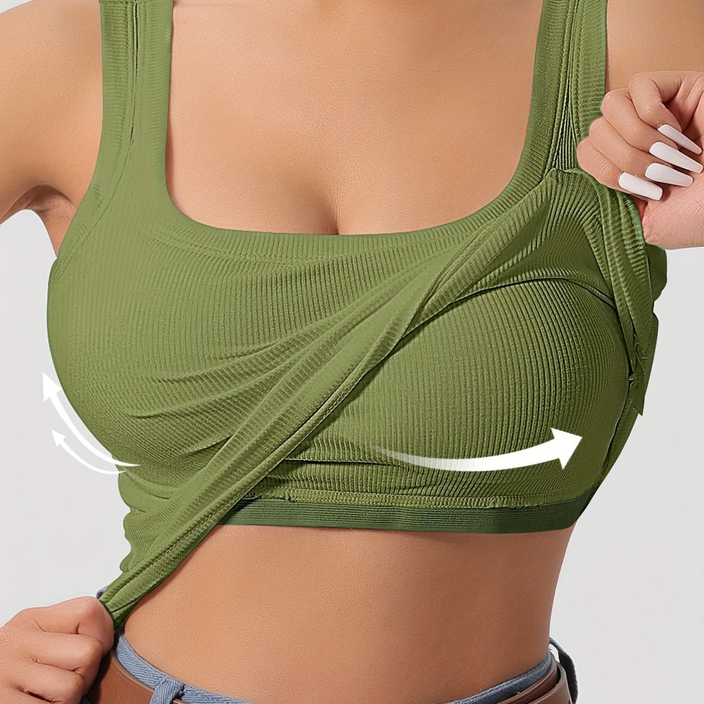 Regata lisa simples com decote quadrado, top canelado versátil com bojo removível.