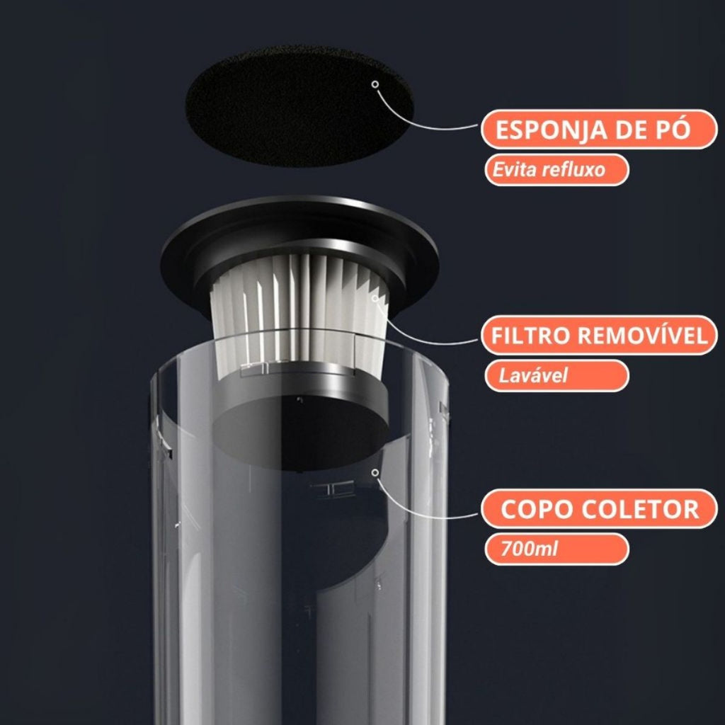 🌀 Filtro lavável: HEPA + espuma anti-refluxo, fácil de limpar sob a torneira, mantendo a sucção máxima.